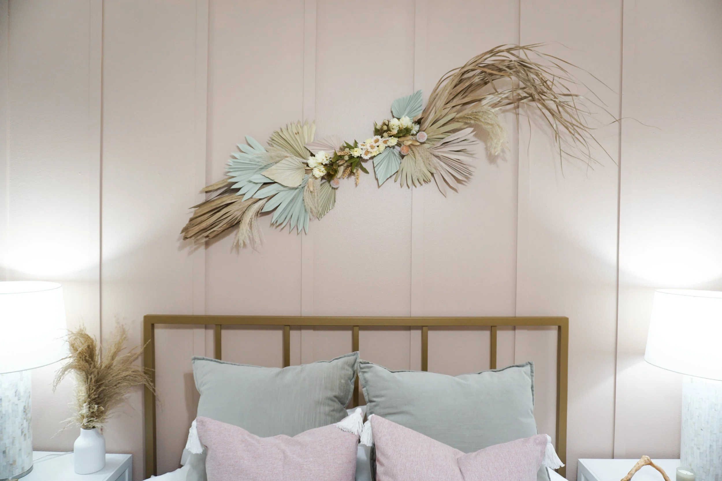 The first thing I did in this room was an easy accent wall to add a little texture to the wall behind the bed. Checkout my ‘No Tools Accent Wall’ blog post. Once the accent wall was complete, it was painting time. From the start of planning this room I knew I wanted to step outside my comfort zone and add a splash of color in this room. When I saw the new 2022 Color Trends palette released by Benjamin Moore, I immediately fell in love with two of the colors. The color on the walls is Venetian Portico (AF-185) and it is a warm, earthy blush color. I also used Benjamin Moore’s color of the year, October Mist (1495), which is a neutral sage green. I used October Mist on the palm leaf wall art above the bed.