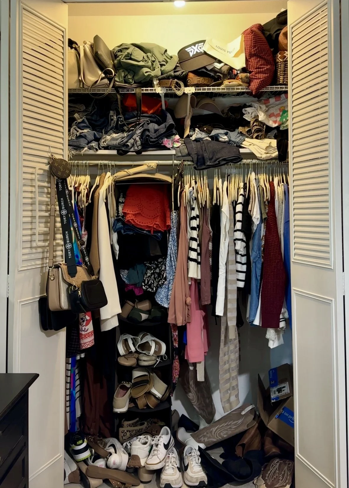 Our home was built in the 1970s, and if you’ve ever lived in an older home, you know that closets weren’t exactly designed with function in mind. My small closet had two awkward top shelves and a single, low-hanging clothes rod that wasted so much vertical space. I tried all the budget storage hacks over the years, but nothing truly fixed my storage problems. I’ve always dreamed of a designer-style custom closet—but the price tags felt unrealistic, and building one from scratch honestly intimidated me. So I went on the hunt for an easy, affordable solution that would maximize every inch of my small closet and look custom. In this post, I’m sharing exactly what I found, how simple it was to install, and why it completely transformed my closet’s storage and functionality.