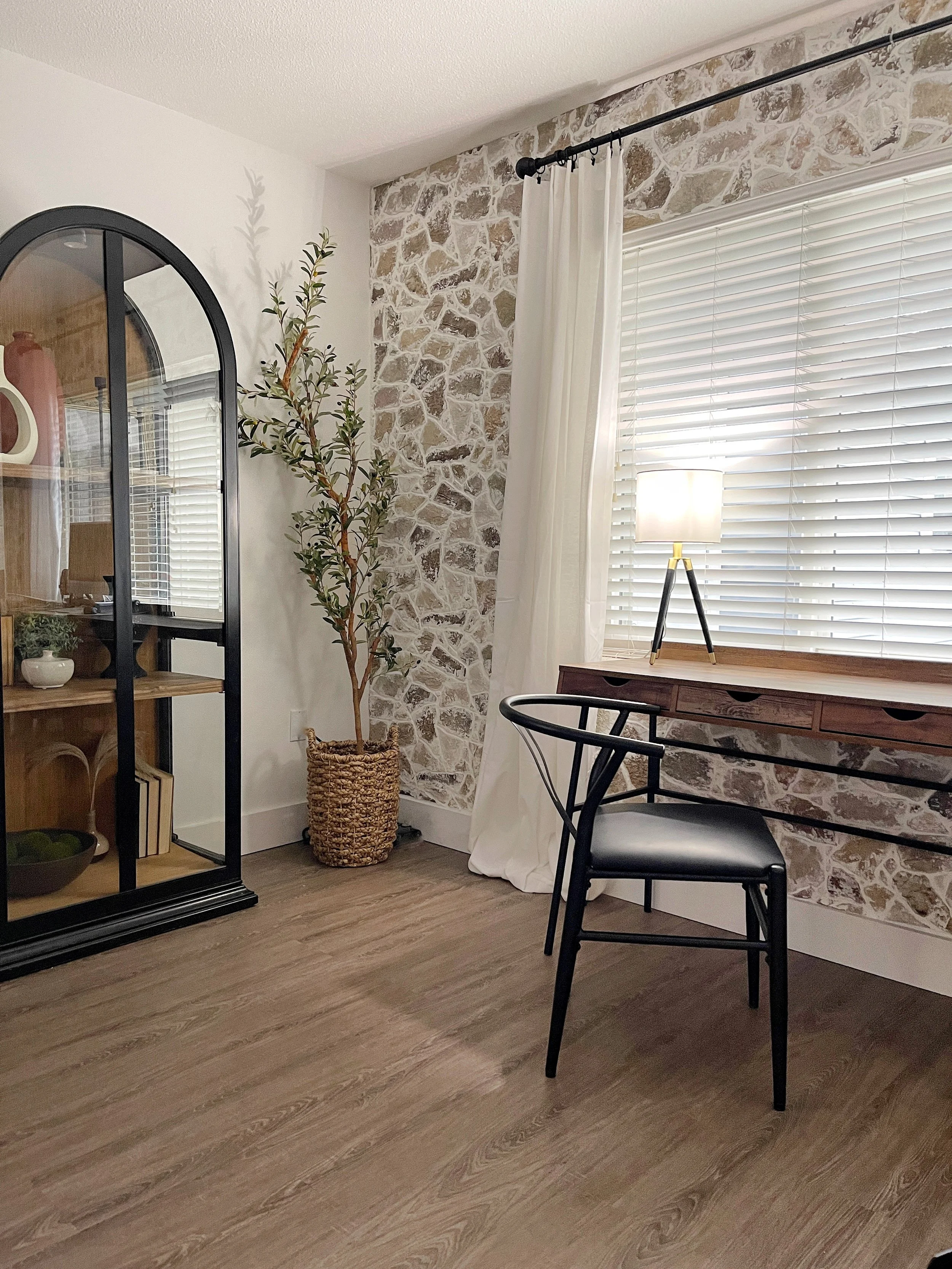 The first and biggest change to our living room was the addition of the faux stone wall. It is by far my favorite part of the living room makeover. I used plastic faux stone panels I found on amazon and did an over-grout technique to them. The result is a cozy cottage vibe that I absolutely love! You can see the full process of the stone wall on my Instagram page.